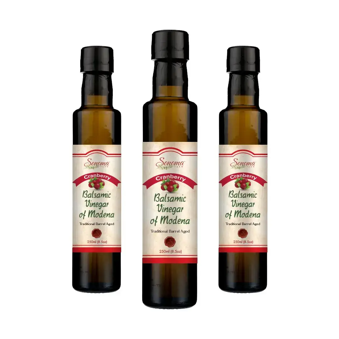 Experience the bright, tangy essence of real cranberries blended with authentic barrel-aged balsamic from Modena, Italy. Sonoma Farm’s small-batch Cranberry Balsamic Vinegar delivers a vibrant, fruity flavor with a smooth, slightly sweet finish—perfect for holiday dishes and everyday gourmet flair.