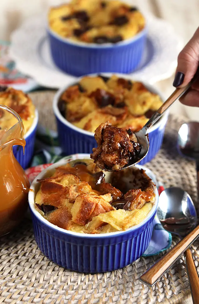Divide half of bread mixture evenly between 2 (6-ounce) ramekins or custard cups coated with cooking spray; sprinkle evenly with half of chocolate. Divide remaining bread mixture between ramekins; top with remaining chocolate.