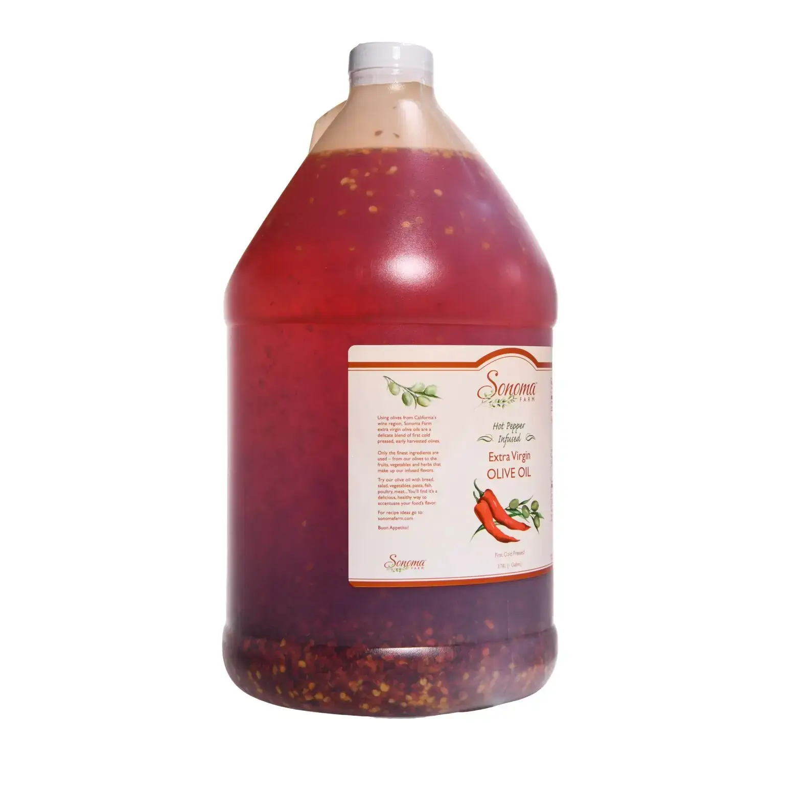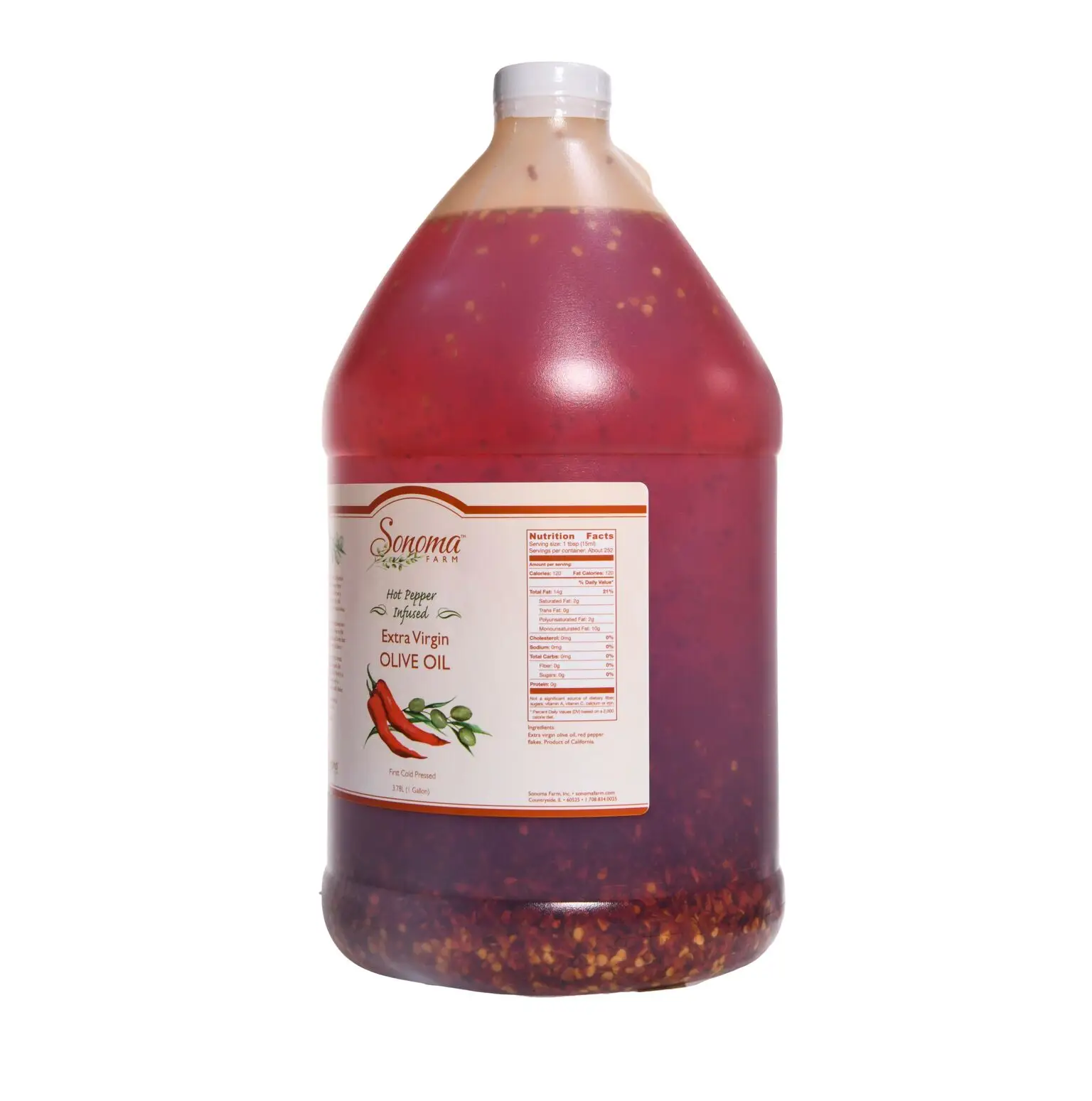 Sonoma Farm’s one gallon bulk hot pepper infused extra virgin olive oil is perfect for pizzerias, food service, and chefs. This oil blends the bold flavor of red pepper flakes with premium cold-pressed extra virgin olive oil. Crafted to bring heat and depth, it’s an ideal finishing touch for a variety of dishes.