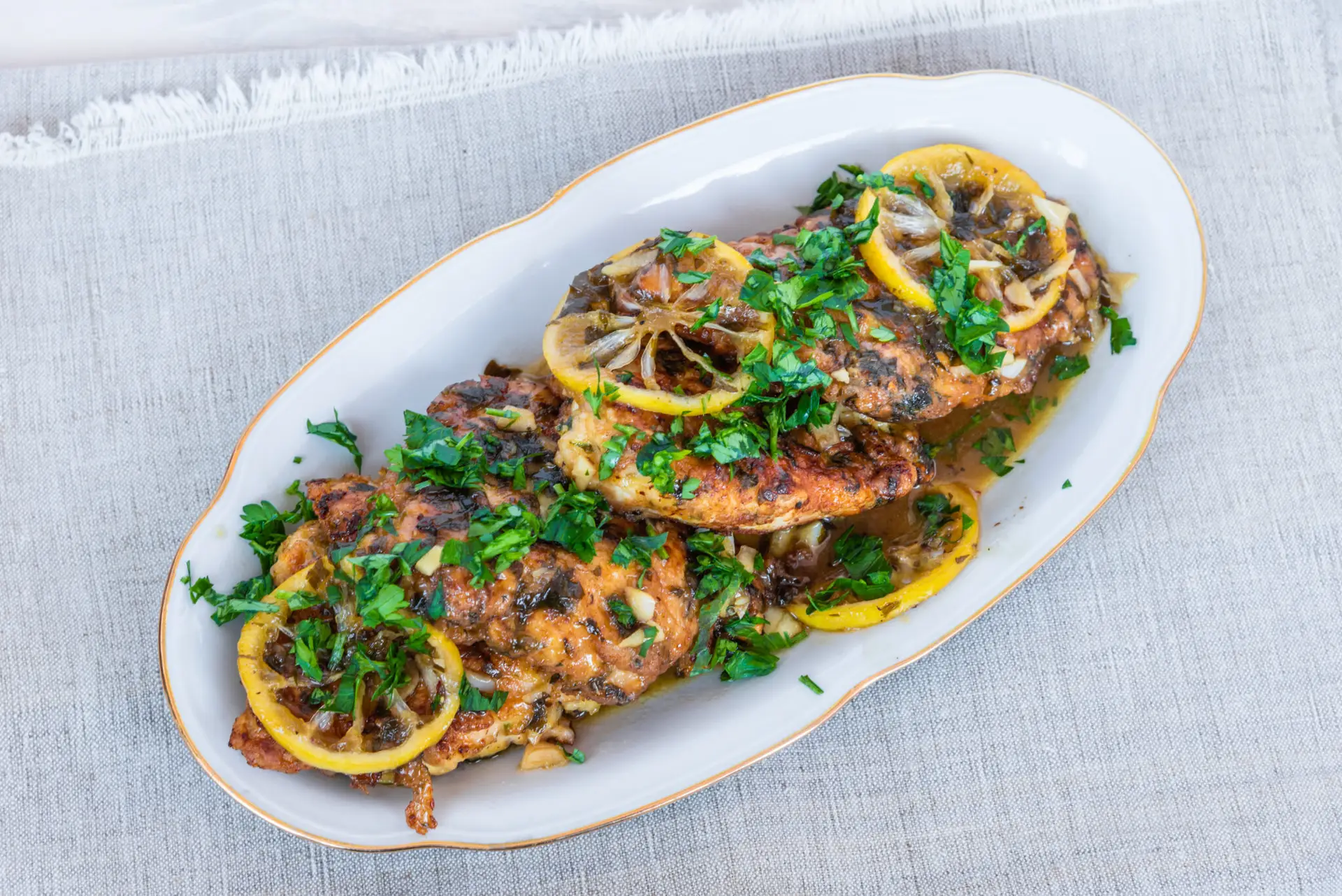 Garnish and serve. Garnish the chicken with chopped parsley and lemon slices.