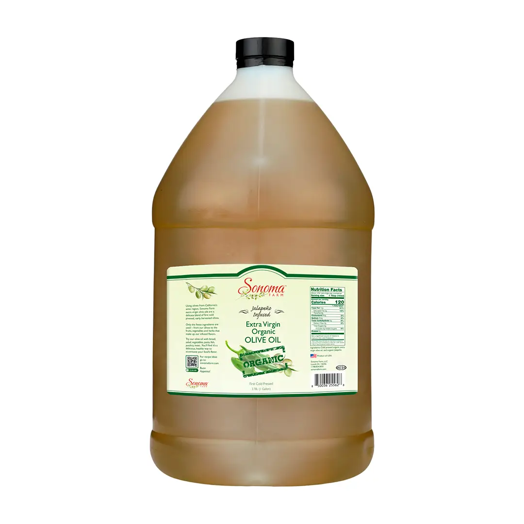Sonoma Farm Jalapeño infused extra virgin olive oil gives you the flavor of just picked Jalapeños. The one-gallon bulk size is great for food service, olive oil shops, restaurants, and chefs.