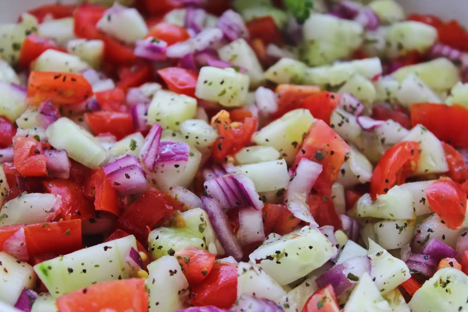 - In a large bowl, place the diced tomatoes, cucumbers, onions, and bell peppers.