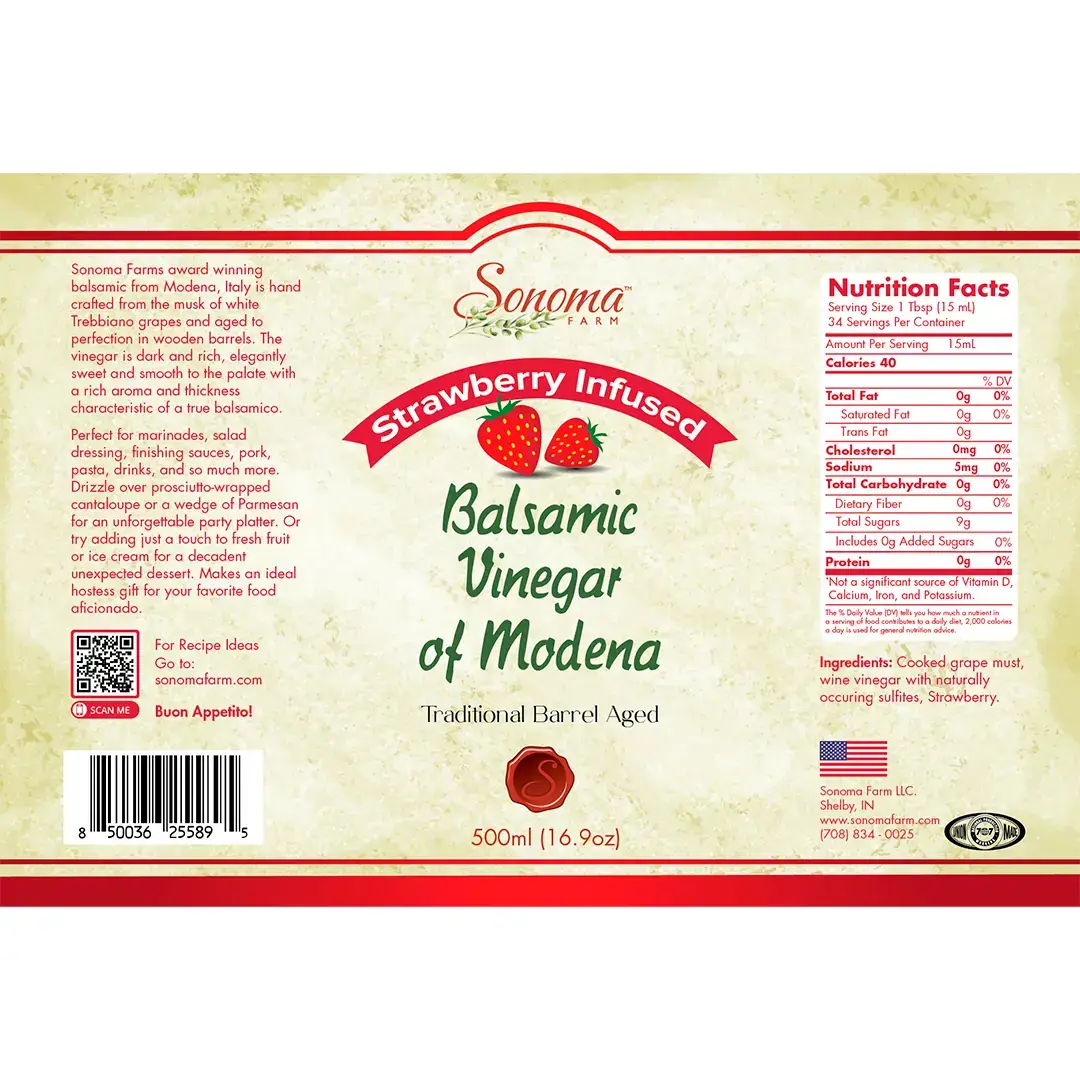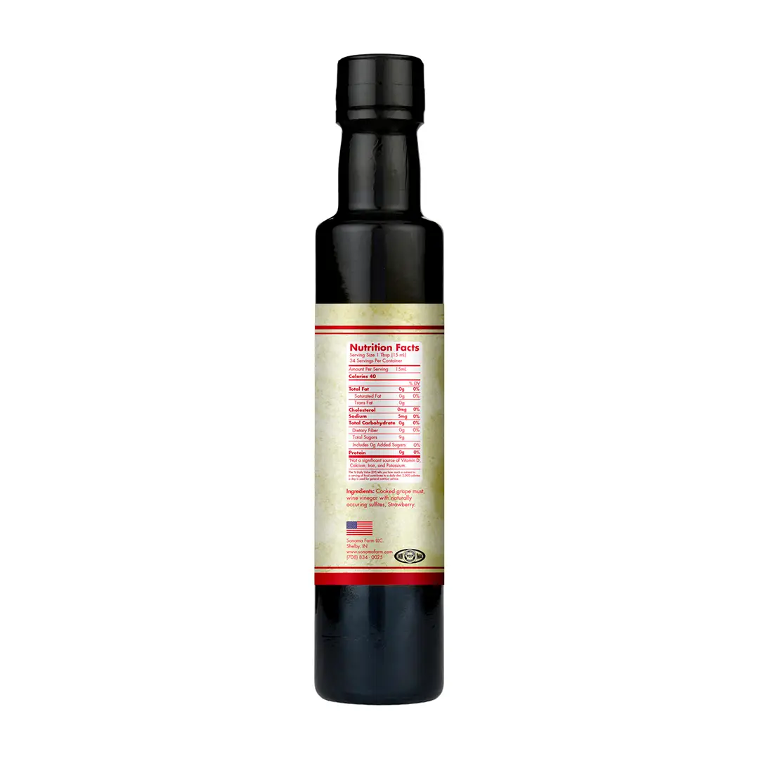 Elevate your dishes with the vibrant, sun-kissed essence of Strawberry Flavor Infused Balsamic Vinegar by Sonoma Farm. This artisanal creation marries the luscious sweetness of ripe strawberries with the timeless sophistication of traditional barrel-aged white balsamic vinegar from Modena, Italy. Perfect for chefs and home cooks alike, this small-batch vinegar transforms ordinary meals into extraordinary culinary experiences.