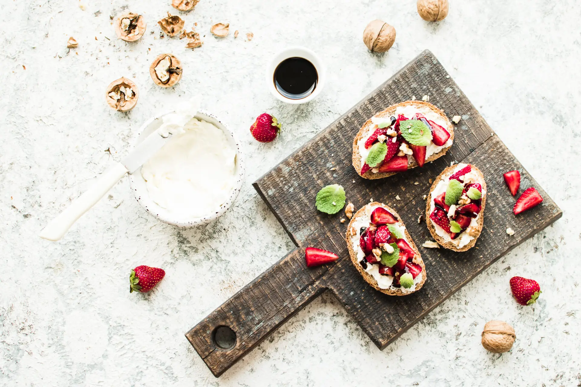 - In a small bowl, toss the strawberries with the mint, olive oil, walnuts and a pinch of flakey sea salt. Spread each slice of baguette with ricotta cheese. Top with a spoonful of strawberries, drizzle with balsamic and sprinkle with more flakey sea salt.