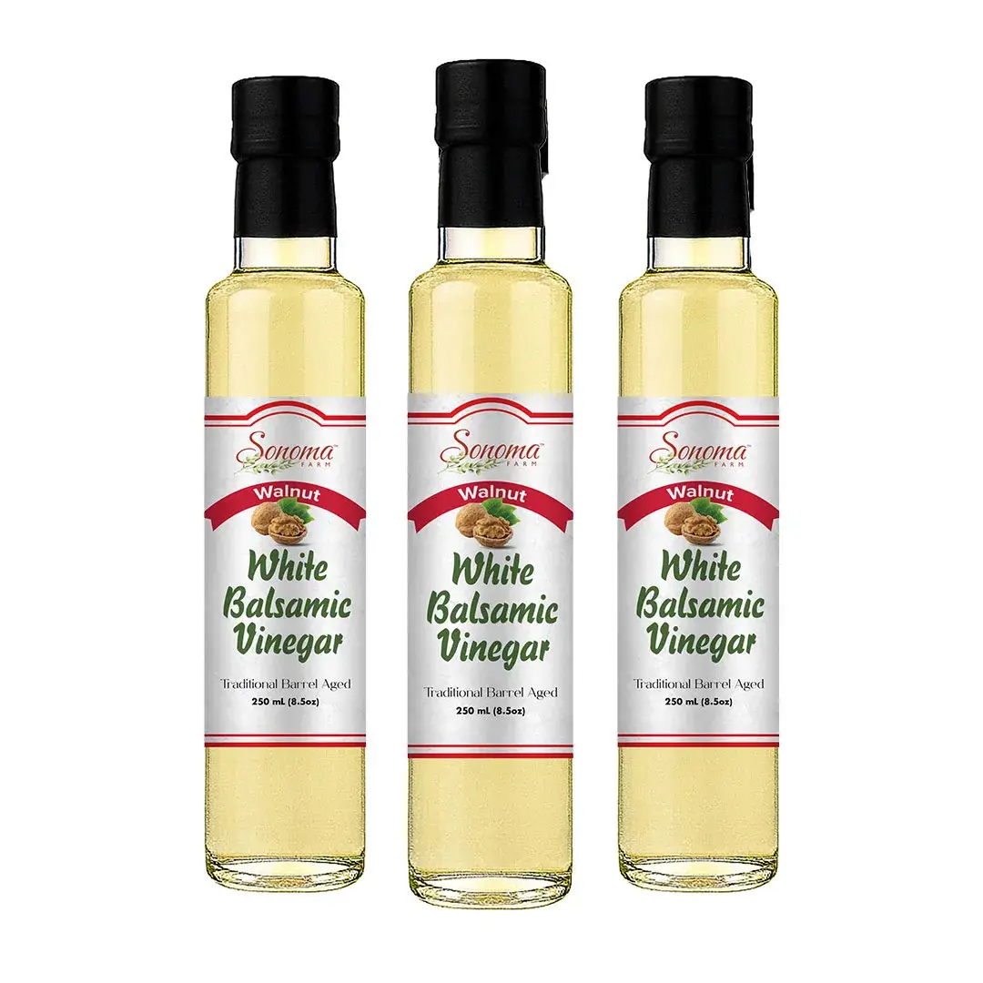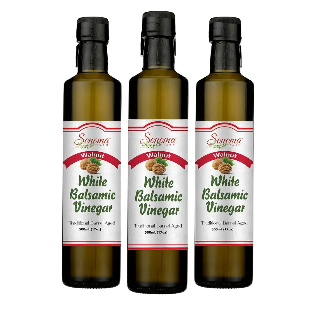 Enjoy the rich, nutty essence of natural walnut paired with authentic barrel-aged white balsamic from Modena, Italy. Sonoma Farm’s small-batch Walnut White Balsamic Vinegar delivers a balanced sweetness and complex flavor—perfect for elevating both sweet and savory dishes.